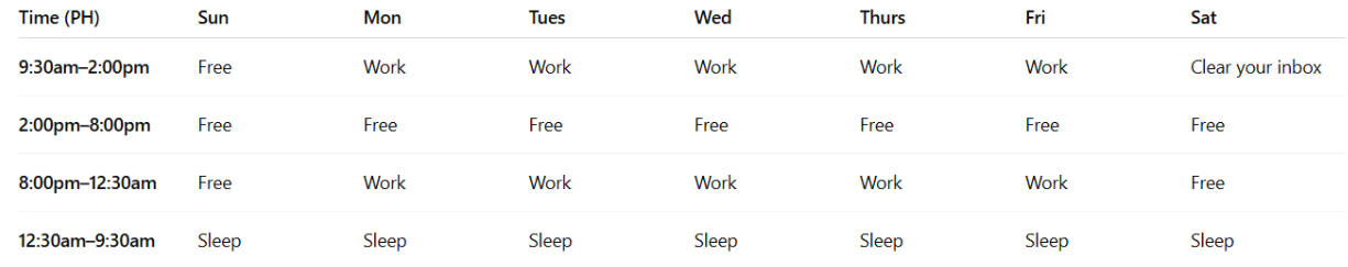 Start your day with a 4.5-hour work block: 9:30am–2:00pm (PHT)